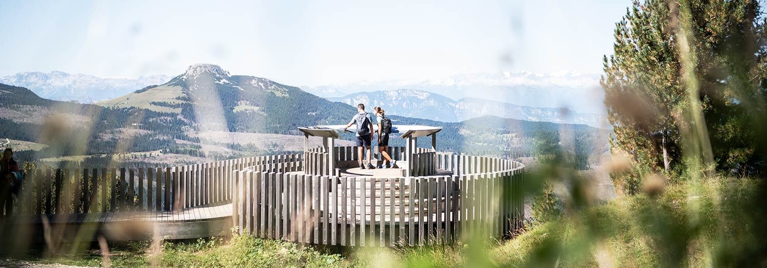 Von der Bergstation des Panoramasessellifts Oberholz in Obereggen führt ein gut markierter und angenehmer Spazierweg (Weg Nr. 18) durch leicht ansteigendes Gelände zur Aussichtsplattform LATEMAR.360°