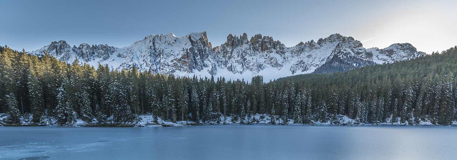Zwischen Latemar und Rosengarten befindet sich der sagenumwobene Karer See. Seine Farben haben ihn auch den Namen „Regenbogensee“ verliehen.