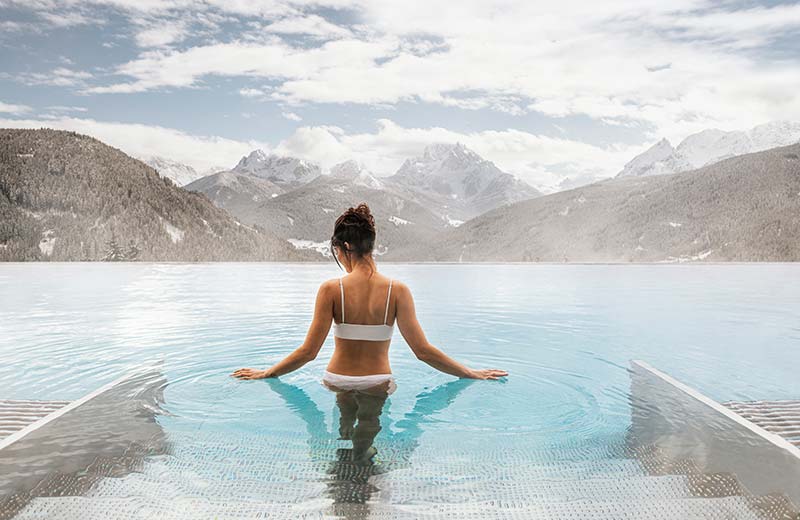 hotel benessere nelle Dolomiti accolgono i loro ospiti con un cocktail di benvenuto. Se arrivate presto, potete concedervi un primo giro nella piscina panoramica, una