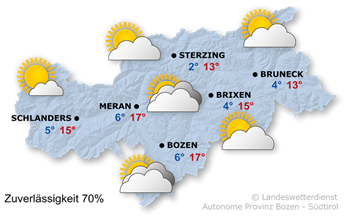 Die Temperaturen liegen am Nachmittag zwischen 13° in Sterzing und 17° in Meran.